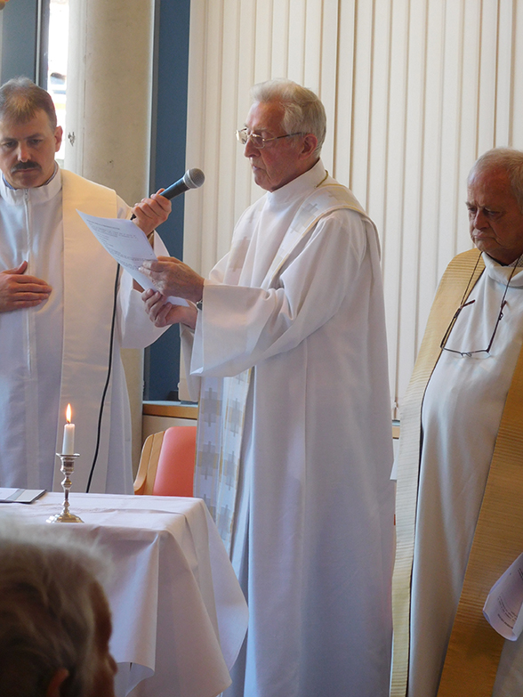 La messe était présidée par le doyen. Il était entouré à l’autel par les autres prêtres du secteur pastoral dont l’abbé Charles Collet, lui-même résidant du home. Tout le monde était à la joie et exprimait sa reconnaissance au Seigneur pour le ministère pastoral fructueux de ce prêtre généreux, modeste et discret. Grand amateur de beauté et de finesse artistique – en témoignent les œuvres d’art ornant les travées de l’église de Longchamps – l’abbé Collet a été congratulé et a reçu deux beaux livres, l’un sur l’art en Ardenne et l’autre, plus spirituel. Après quelques mots de remerciements de sa part, c’est dans la bonne humeur et un petit verre à la main que s’est poursuivi cet événement de la vie bien remplie d’un prêtre simple et entièrement donné à sa vocation. Merci et encore félicitations !