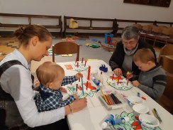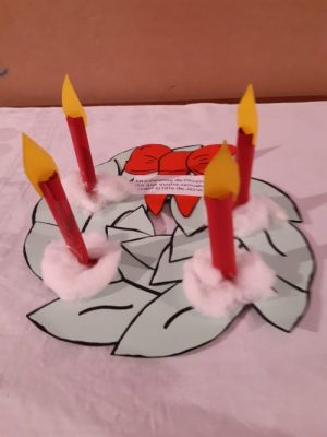 Après le partage de la collation, les enfants ont bricolé une couronne d’Avent. Ils ont mis la 1ère flamme. Afin de les aider à voir la progression vers Noël, les parents ont été invités à ajouter , chaque dimanche, une flamme de plus, accompagnant ce geste d’une petite prière.