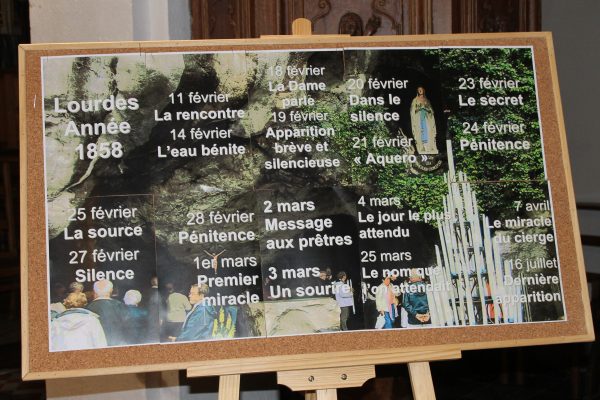 Durant ces offices, les 18 apparitions de Notre-Dame à Bernadette ont été évoquées et illustrées par une photo de la grotte que nous avons découvert en entièreté le 9ème jour de la neuvaine. A noter aussi que chaque jour un cierge était allumé devant Notre-Dame.