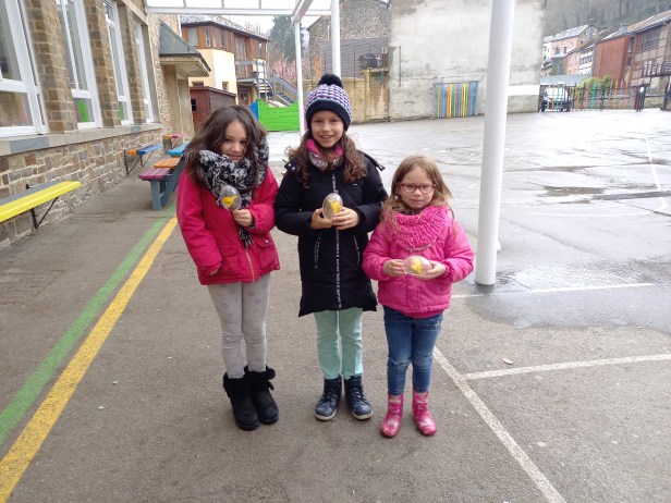 De retour à Saint Joseph, on a observé le contenu des œufs. Les enfants ont fait preuve de beaucoup d’imagination, d’inventivité et de motivation pour le remplir ! Ils ont eu leur récompense : un sachet de d’œufs en chocolat caché par les cloches dans la cour de l’école !