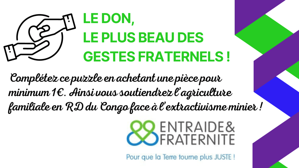 - se rendre dans une église et/ou à la messe dans sa paroisse et soutenir la campagne de Carême d’Entraide et Fraternité. De quoi s’agit-il? De compléter un puzzle en achetant une ou plusieurs pièces pour 1 euro minimum. L’argent récolté servira à aider les associations au Congo qui luttent contre l’extraction des mines et les conséquences sur les petits agriculteurs.