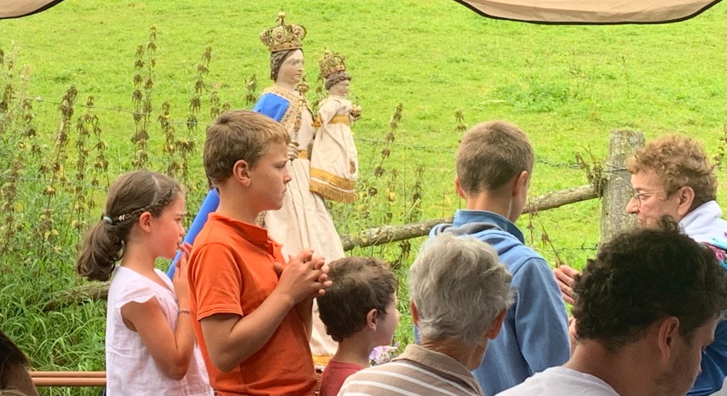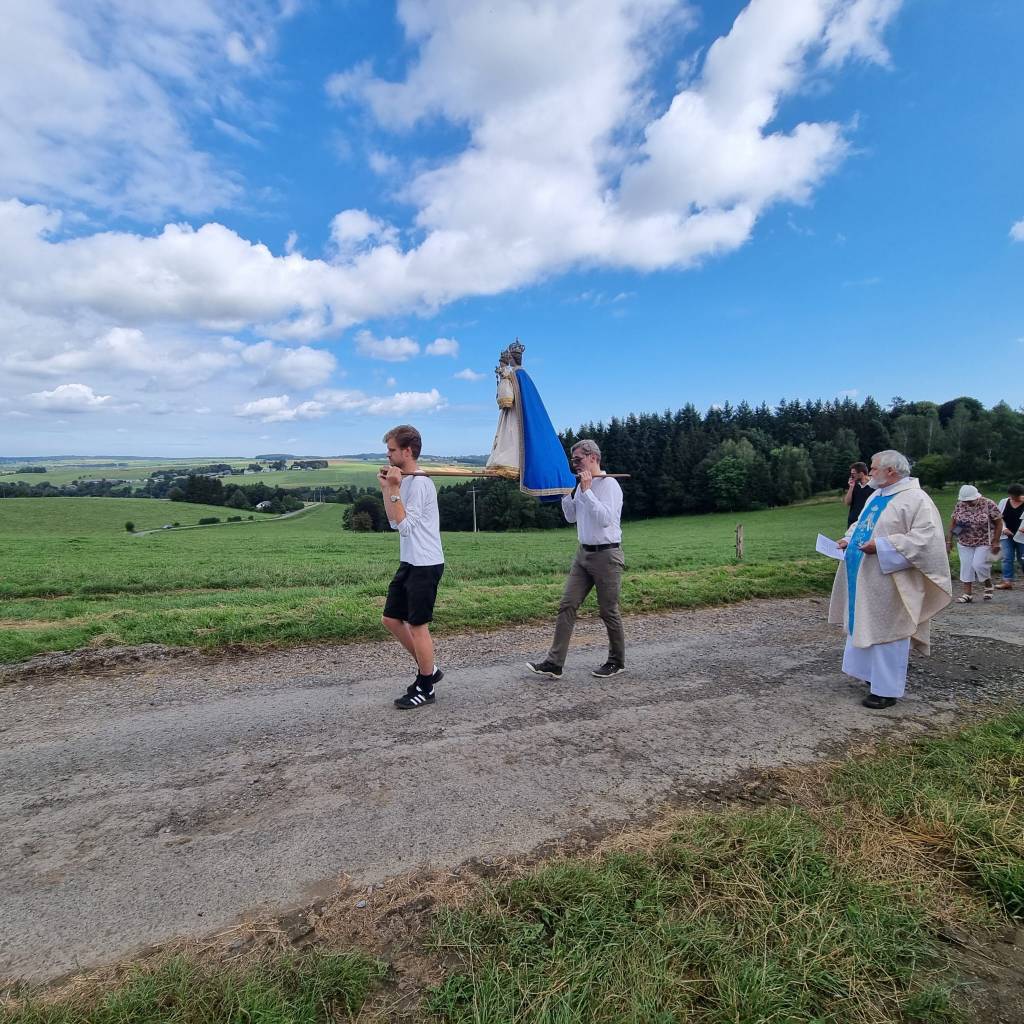 Prêts pour le départ à 10h30, les porteurs dressent Marie sur leurs épaules et c’est parti. Le cortège se met en place spontanément, chacun trouvant sa place et son rythme. Les chants et le chapelet résonnent au milieu de la cathédrale d’arbres qui marquent la sortie du village. Le groupe s’agrandit, s’étire et ramasse les fidèles qui attendent sur le bord du chemin. La Sainte Vierge se dresse bien haut et est visible de loin. Il faut dire que les porteurs frôlent les deux mètres et ajoutent à la majesté naturelle de la Sainte Vierge. Le chemin se prolonge vers les champs, les vaches semblent nous attendre quand la vue se dégage vers la petite chapelle, point blanc au loin et objectif à atteindre. On devine le comité d’accueil des plus âgés regroupés autour du vieil édifice. Les chants résonnent, le chapelet s’égrène, les quelques arrêts rythment la cadence. Les porteurs sont vaillants et concentrés. Des vélos et des poussettes rattrapent le groupe. Tout le monde est là, c’est le 15 août, il fait beau, Marie nous rassemble !