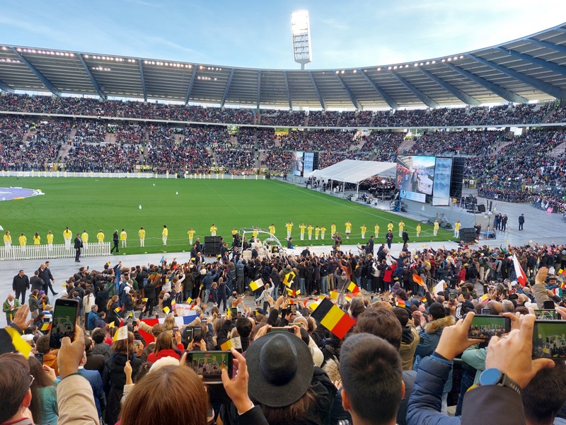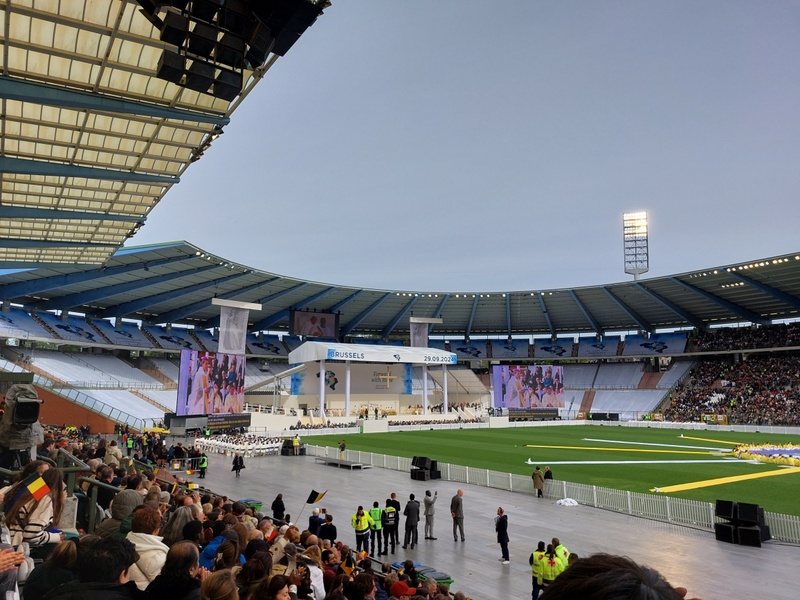 Un stade qui vibre pour un pape. Cela pourrait être le titre d’un roman d’anticipation. Et pourtant, plus de 37 500 personnes avaient fait le déplacement pour accueillir et assister, à Bruxelles, à la messe du pape François, ce dimanche 29 septembre. Avec ma compagne, nous avions la chance d’être dans cet antre. Jamais sans doute je n’ai trouvé plus belle illustration du mot « communion » dans le sens étymologique du terme.