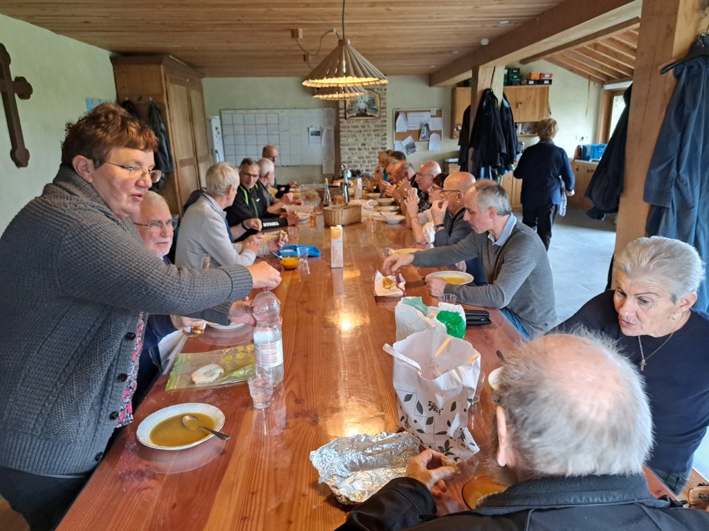 En prélude de la marche, nous avons partagé soupe et pain à la Fraternité de Tibériade, en l’agréable compagnie du Frère Joseph. Rassasiés, nous nous sommes mis en route vers le Sanctuaire de Beauraing. Le soleil – présent ! – réchauffa nos cœurs et affermit nos pas. La marche se déroula dans une belle sérénité.