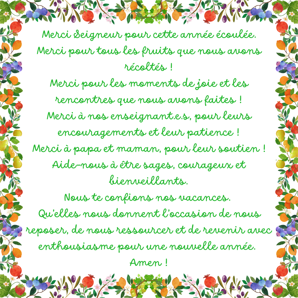 À la fin de celle-ci, un petit présent les attendait : des pâtes de fruits, délicatement emballées, offertes avec une prière pour accompagner leurs vacances. Ils sont repartis, le sourire aux lèvres et le cœur léger, prêts à emporter avec eux les souvenirs de cette année écoulée. Bonnes vacances à tous, pleines de découvertes et d’aventures !