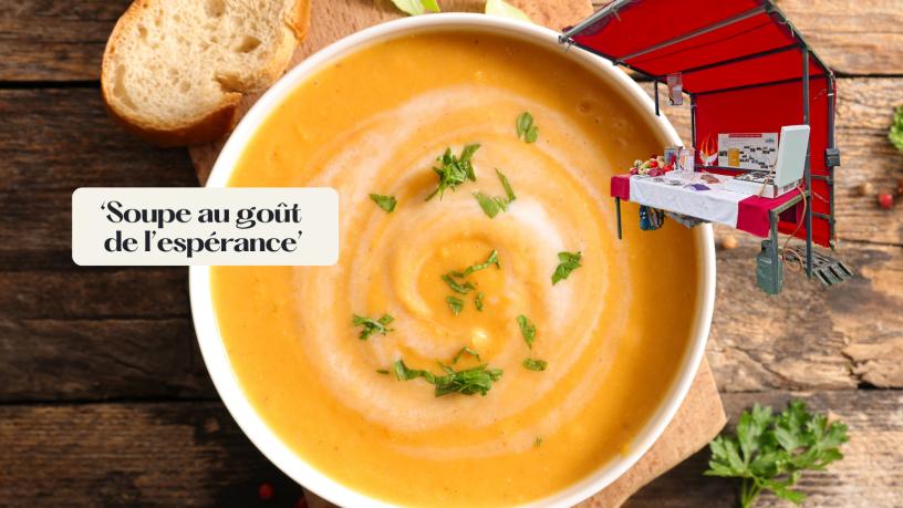 Nous adressons un grand merci à nos deux cuisiniers, qui ont préparé une « Soupe au goût de l’espérance » savoureuse, composée de potirons, de carottes, d’oignons, agrémentée d’un goût de lard fumé et d’une note d’espérance par l’ajout de persil haché.