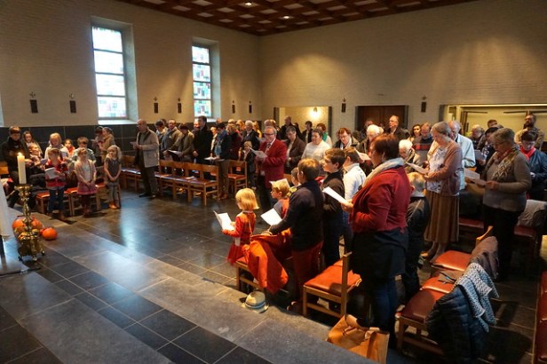 Après un break pour prendre un café, une galette et interroger plus avant les animatrices ou se concerter, Mgr Vancottem est arrivé, suivi de près par M. le Doyen Roger, et les acteurs de la Célébration ont convergé vers la sacristie pour se préparer. Entretemps, les chrétiens composés d’enfants et d’adultes se sont rassemblés et ont rempli les deux parties de la nef : les choses « sérieuses » pouvaient commencer : l’Eucharistie, présidée par Mgr Vancottem, avec les abbés P. Roger, A. Uwayezu et R. André.